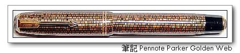 Parker Golden Web Posted on 6 一月, 2007 by CWY 派克的Golden Wed在真空上墨中雖然不是最罕見,但是卻是最知名的一款設計。最主要還是在於金網的花色實在太特別。小佩在鋼筆實驗室中有非常豐富的說明,所以在這裡也不用說太多了。