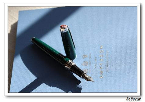 沒錯, 雖說Leman不起眼的外表, 可能會讓人誤為它是便宜的發色塑膠桿鋼筆, 但這事實上, Leman的筆桿不是膠桿, 也不是什麼珍貴XX樹脂, 甚至不是一般金屬筆桿中常見的不鏽鋼. 這隻筆是以銅打造, 筆身的綠色部份則是銅製筆桿上的漆塗, 近看才發現表面為光滑異常的鏡面而沒有任何細紋, 這層漆塗不是一般平價或流行筆款中常用的噴漆. 而是近似於中國漆質感的烤漆. 配上這隻筆英國賽車綠(Racing Green) 的顏色, 沒錯, 看起來像極了跑車的車身烤漆. 輕敲身筆, 傳來清脆的響聲, 說明了筆桿的堅實度. 果然是正宗萬年筆的氣勢. 值得一提的是, 這個筆身表面極為耐用耐刮. 日常使用完全沒有強固上的考量. 也不用特別保養, 日常使用刮痕??? 沒見過. 這筆只要拿布一擦, 馬上又光亮如新. 永不顯舊.