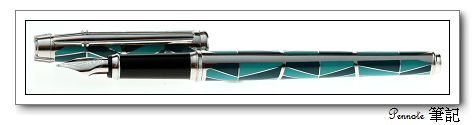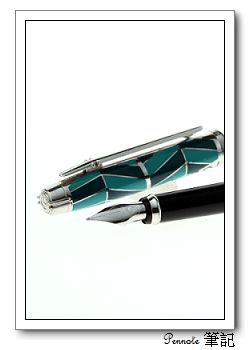 照片中的筆由藝術家Karl Diesner所設計於1994年發行。筆桿呈現規律的幾何圖形,冷冽的鍍白金線條襯托出藍綠交錯的方塊。具設計師表示,這樣設計的目的在活化我們的視野。值得一提的是這款筆的筆桿採用景泰藍(根據維基百科的定義是一種將各種顏色的琺瑯附在銅胎或是青銅胎上,燒製而成的瑰麗多彩的工藝美術品),在西方鋼筆的領域這樣的做法到是不常見,將來有時間再進一步研討這款筆的工法。另外筆尖採用18K金尖,而上墨系統則是採用吸墨器。長矛型的筆尖或許也是這牌筆的一種特色吧。