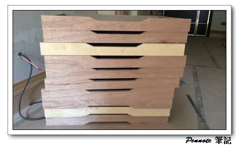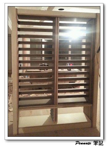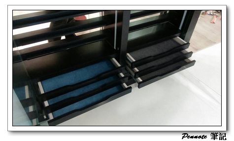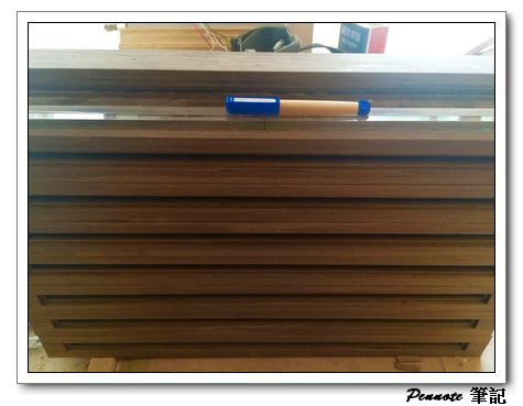 這部份與原始的設計也不能,原始設計是利用兩個小圓柱將筆頂住,筆的透視性非常的好。不過我想起921大地震時有人的瓷器整櫃倒下去的悲劇,與設計師討論後,改成利用灰黑色的塑膠條嵌入木頭中,後方用矽膠黏住增加穩定性。架上則預計利用水晶周之前推薦的博物館級膠來固定住。應該這樣就萬無一失了。