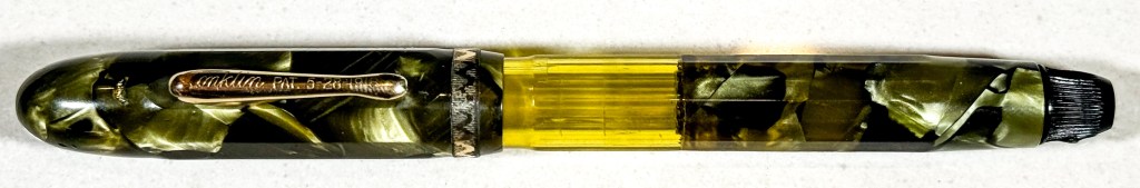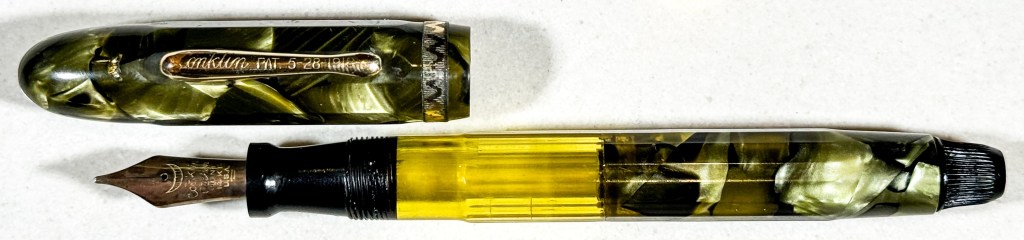 我先從書裡面的一則廣告看到了跟這支筆很像的筆,我注意到這筆命名為Nozac Classik。他上面提到這筆的儲墨量比墨囊式的增加了35%,總共有四種顏色,儲墨窗是可選擇的,價格大概是賣6到10美金(廣告並沒有說明差在哪裡?)不過你要是能找到其他顏色的話我相信一定不便宜,在當時拉桿的Conklin鋼筆就只賣3.5左右。還特別強調上墨就像轉動手錶一樣容易。我注意到的時間是1931年,我又往前翻書,我才理解到這筆是做十二邊形的,當年主要是為了對抗Eversharp的Doric所設計。看來有刻度大概就是1933年之後的事情吧(從書上的照片看來,不想要看仔細)。比起Doric確實這筆的高級感真的好很多,但是我們不能忘記了Doric的可調式筆尖,也是獨步武林的。也許有大量書寫習慣的人會選擇這隻筆吧。