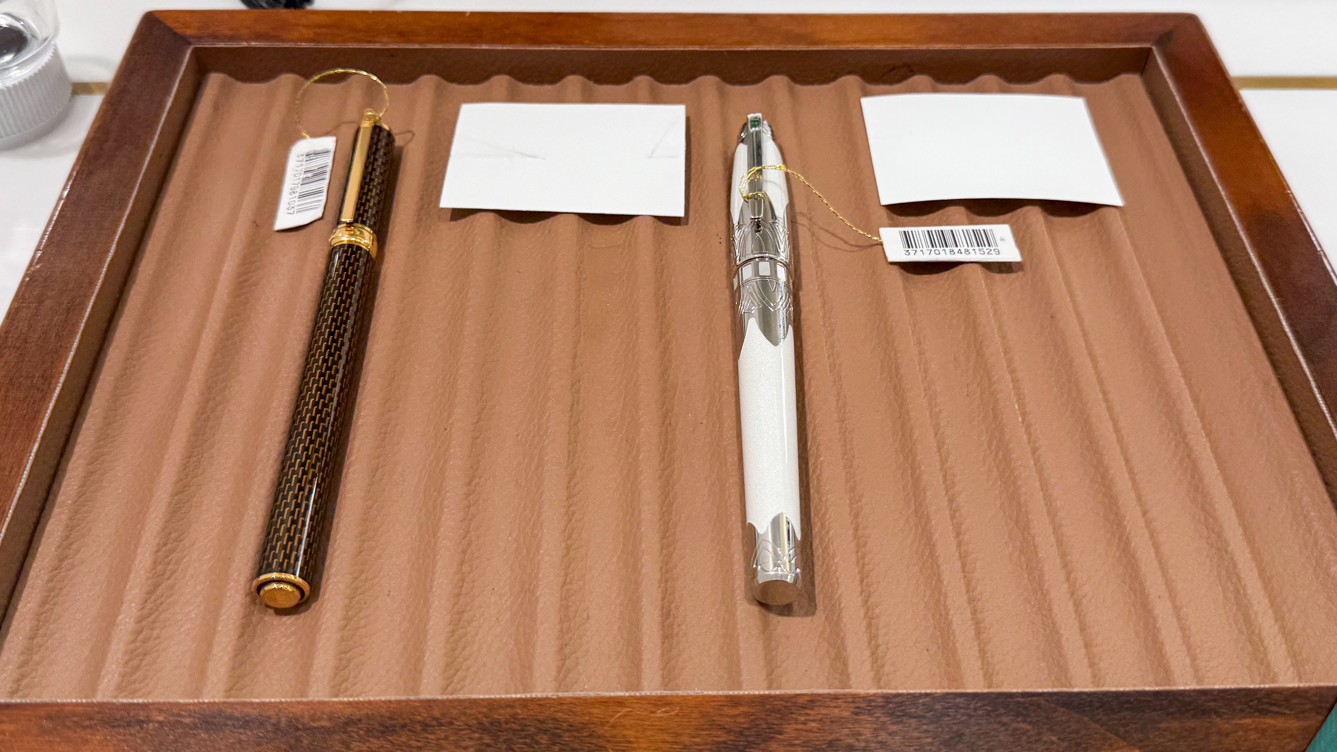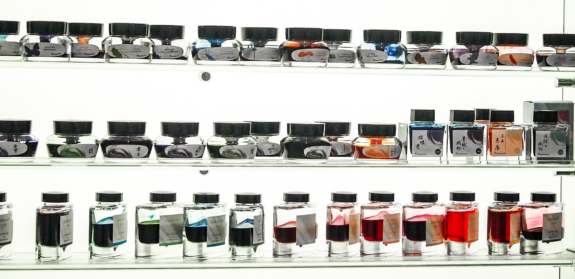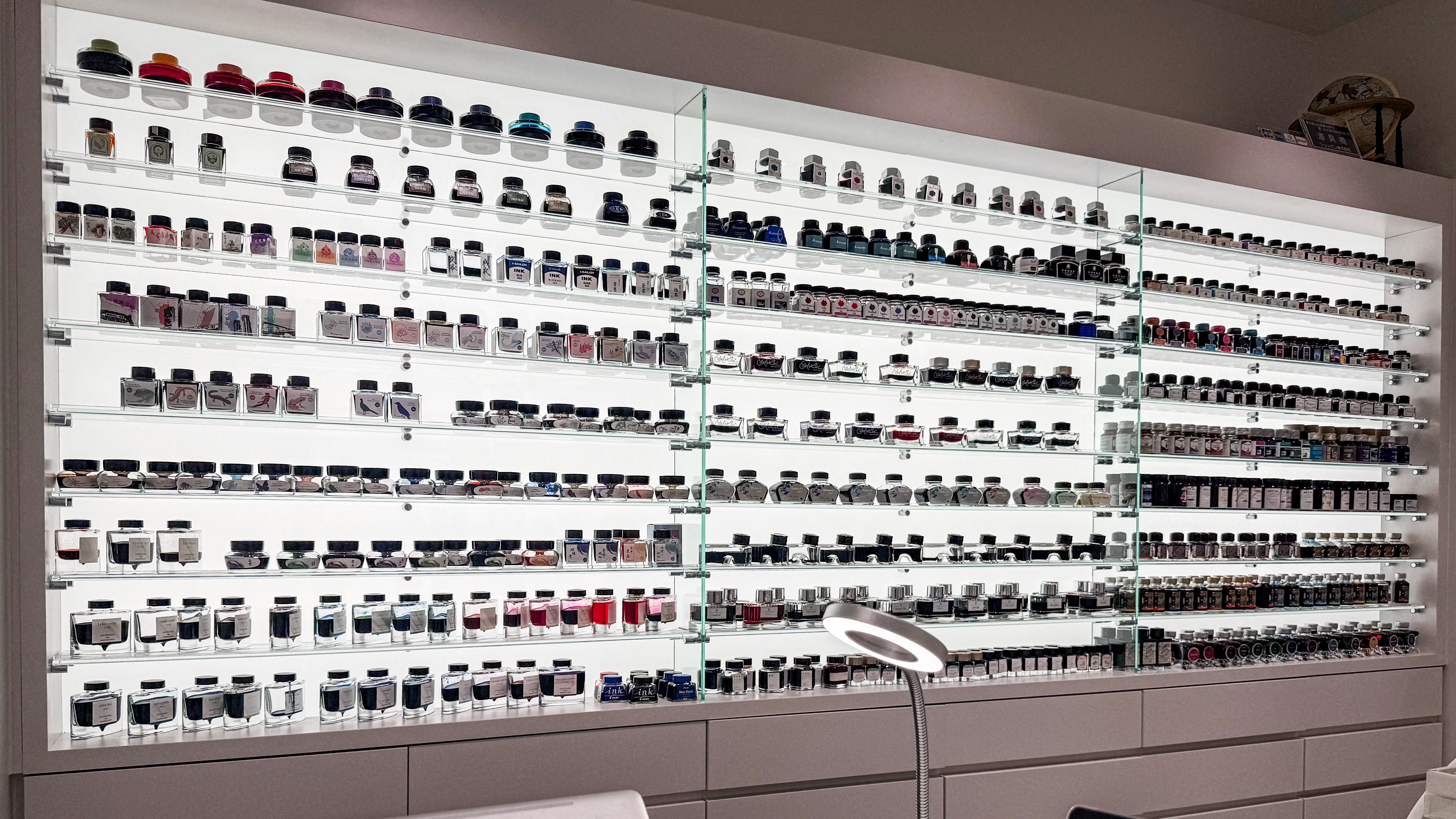 到了現場,我覺得有一種超乎我想像的簡潔,非常的乾淨舒適。我特別喜歡牆壁上的墨水,在現場的光線下顯得非常漂亮,看得出來每一罐墨水似乎是都有用過的。服務人員一對一並且很仔細的檢查每一隻筆的狀況。我看到某筆的狀況很好,但是網站上寫著有瑕疵,我在現場看了又看,找不到瑕疵,我就問了到底是哪裡有瑕疵,他拿了放大鏡給我看,就找了一下才找到。我不禁對日本的要求標準肅然起敬。相較於eBay真的是天壤之別,這種狀況到了eBay形容一定是excellent。讓客戶感到安心,我覺得這是日本商店特有的特質。不是說其他地方就沒有,而是在日本這樣的感覺特別強烈。