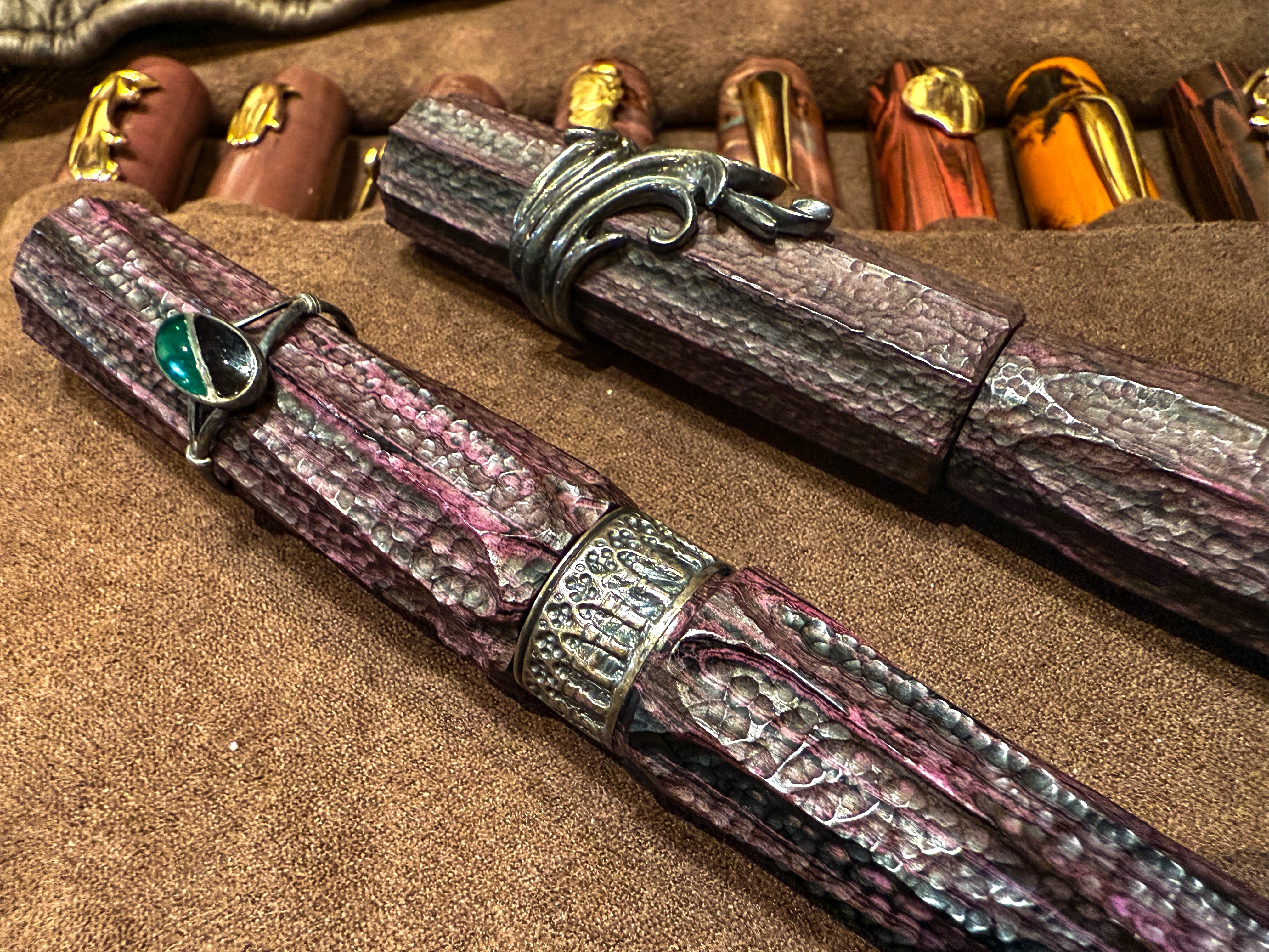 很快的他就回復理性,拿出他第一個筆盒, 手工純金筆夾鋼筆,每一隻鋼筆都長得一樣,只有純金的筆夾不一樣,我心裡想著不愧是手工達人,做事都這麼狂。跟著就拿出很像岩石的東西,原來也是鋼筆,材質竟然是彩色的硬橡膠,從三角形,一直做到九邊形各種花色各式各樣!聽說還要跟老師父一邊聊天一起做,而且是慢慢增加難度,這個真的一般人做不來。接著就拿出他最厲害的銀雕,日本國寶級的老師父幫他雕的,聽說只有他能溝通!當他還是學生的時候,就拿出了雕著華麗仁王的ZIPPO打火機,他表示這是他學生期間全心全意收集折價券,超市結束前的半價餐,整個房間都貼滿了折價券外加打工才積攢下來的-原來從小就是客製達人!這幾年來應該是雕了很多,不但不太隨便拿出來,怕被帶走。接著還發現他竟然收藏了日本各大百貨文具店專屬的古董筆,他特別喜歡伊東屋的,說是比較有情感,但我看就是品質比較好。Pen Reuse立刻拿出伊東屋的木紋硬橡膠,要他拿筆來換,他立刻掙扎了起來了(晚一點討論-當下這麼說),弱點暴露無遺。