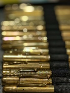 早在前一天,我就聽說 Pen-Box 準備了不少筆要來打擊我們,後來聽說進一步的提升到後背包,看來這一次是毫不留情了。我輾轉打聽到只有來自宇宙的礦物-黃金筆能夠剋制他(手工筆沒有任何的可能性,畢竟他的道行太深)。我翻箱倒櫃將家裡所有的實金筆找出來,打算像對付吸血鬼一樣給他致命的一擊,讓他化成泡沫。見面我就立刻先攻拿出實金筆來壓制他的氣焰。我可以看到他的眼球裡反射著閃耀的金光,May Gold be with you – 我心裡想的這一定是真愛。
