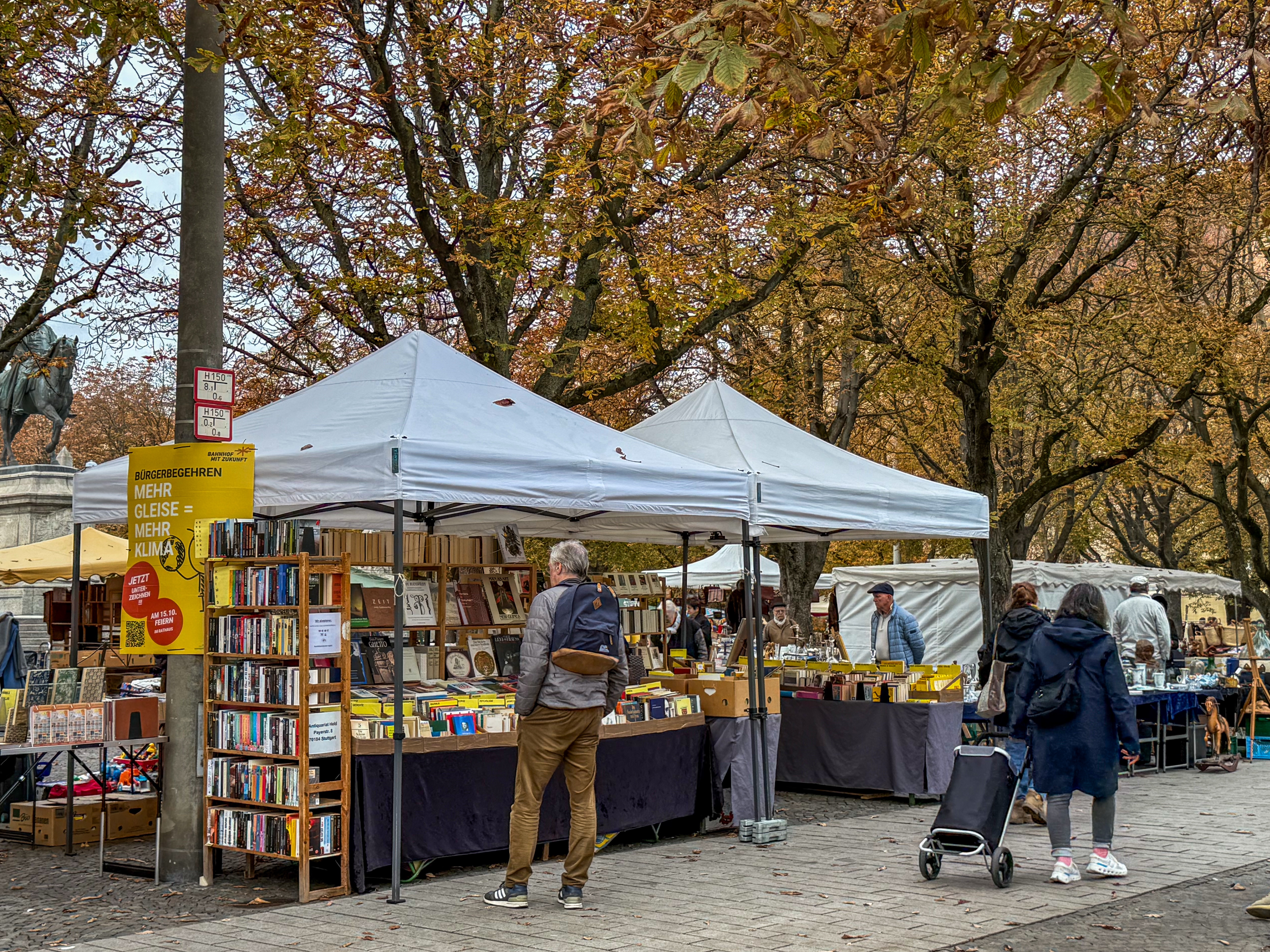 閒逛的過程中,我找到了一些彩繪著斯圖加特景物的卡片,1960年代的風格令人感到心動。我問老闆多少錢?他回答每一張都不一樣,他的回答立刻引起了我的警覺(果然這裡還是會讓傻子多付一點)。我隨便拿起了一張他告訴我八歐元。我心裡就覺得這個價格不對,網路上賣二十元-他接著說,我繼續往前走,就看到其他的攤位標價三張十元。只是我的興致,因為前面的不愉快而受到影響,隨便翻一翻就不再多做停留。這裡也賣著不少的錢幣,有些還蠻好看的,便宜的大概就兩三歐元,我一度很想買,後來想一想買了也沒什麼用,家裡的鋼筆已經堆積如山了,還是不要亂買好了。