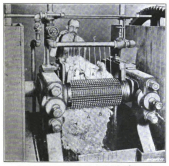 圖 2. 研磨與洗滌粗橡膠「塊」("Biscuits"): 圖中展示了巨大的滾輪機器,工匠正將原始的橡膠塊放入機器中進行粉碎、清洗雜質。