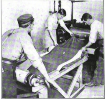圖 3. 將橡膠軋製成所需厚度的片材: 工匠們正合力操作機器,將經過處理的橡膠壓成薄片,這將是後續製作筆桿與組裝零件的雛型。