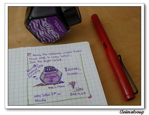 至於塗鴉所使用的紙,據她表示"美國網路很多人討論適合書寫畫圖的紙,目前最喜歡Rhodia,比moles kine不暈,乾的較快,比clairefontaine薄,淺紫色的格子塗鴉很方便,最重要的是價錢可親“。老實說紙一直是筆友比較不懂的一塊,基本上中文網站中也不知道哪裡有關於如何選擇紙的討論。animalsoup小姐的經驗提供了筆友在選擇時的重要參考。