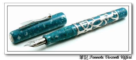 今天筆友Super帶來了他的收藏 Visconti Uffizi。我想大部分的人都像我一樣一時之間搞不清楚這筆的來歷。原來這筆早在1994年便發行了,算是很早期的限量筆。銀雕的筆身限量500枝,搭配著Visconti獨家類似Plunger的上墨系統。而筆尖令人有點意外的是竟然還帶有些彈性。一時間我們突然覺得這十多年來鋼筆世界的進步真的是很有限。