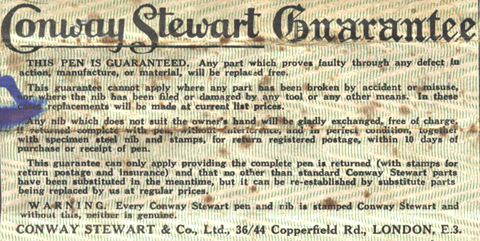 照片是大約50-60年前Conway Stewart的保證書,保證如果筆尖不符合消費者的使用習慣10天內保證更換。